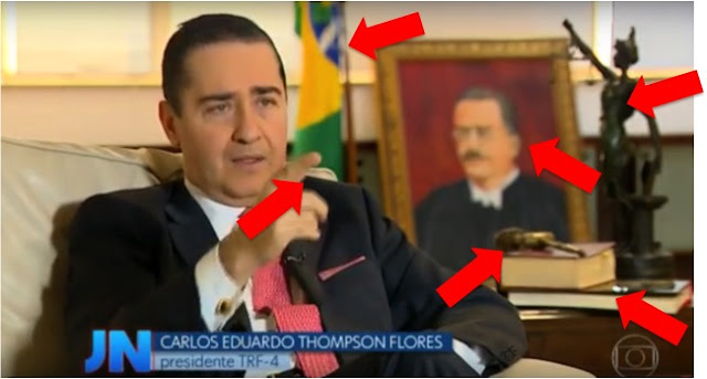 E uma entrevista com o presidente do TRF-4, Carlos Eduardo Thompson, com todos os signos saturados da canastrice televisual – com a câmera enquadrando ao fundo a bandeira nacional e um quadro em aquarela de um respeitável juiz togado, um martelo de juiz pousado sobre um grosso livro, cabelo emplastrado de brilhantina, uma calma estudada e sobrancelhas levantadas em soberba por posar confortavelmente em uma grande poltrona ao lado de uma estátua de bronze em clássica pose de saudação e Poder, tudo em rede nacional.