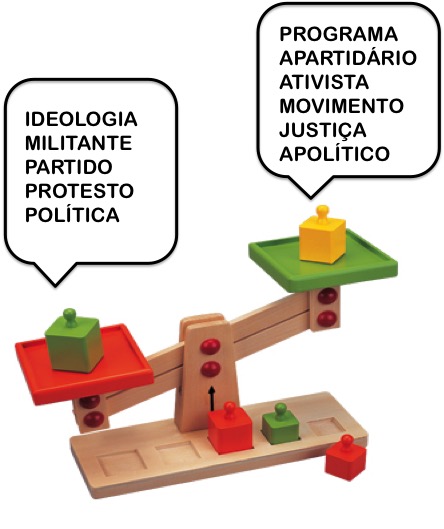 Nesse processo de despolitização, julga-se os méritos através de uma balança na qual as palavras são carregadas de culpabilidade prévia, naturalmente pesando em um dos lados. Tudo se passa como se um dos lados tivesse palavras mais pesadas, carregadas. De um lado palavras “leves” como, “apartidário”, “movimento”, “justiça”, “ativismo”. E do outro as “pesadas”: “partido”, “protesto”, “ideologia”, “militante” etc.