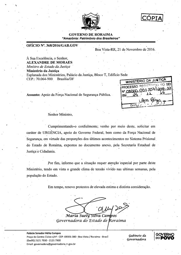 Num ofício tornado público pela Istoé, a governadora Suely Campos pediu o apoio em “caráter de URGÊNCIA” (maiúsculas no original) por causa do “grande clima de tensão”.