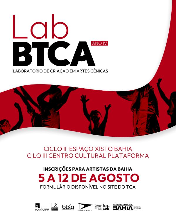 O Balé Teatro Castro Alves (BTCA) abre inscrições para os Ciclos II e III do LAB BTCA, programa de extensão voltado à formação artística de jovens tendo a dança como eixo central. As inscrições são gratuitas e poderão ser feitas de 05 a 12 de agosto, por meio de formulário online disponível nas redes sociais do Balé (@btca.oficial) e no site do Teatro Castro Alves (www.ba.gov.br/tca). A lista de pessoas selecionadas será divulgada no dia 14 de agosto, e o início das atividades está previsto para 18 do mesmo mês, para o Ciclo II (Espaço Xisto Bahia) e 19 para o Ciclo III (Espaço Cultural Plataforma).