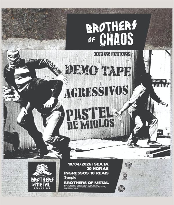As bandas Pastel de Miolos, Agressivos e Demo Tape são as atrações do Brothers of Chaos, uma noite com promessa de muito punk, hardcore e rock e que acontece no dia 10 de abril, a partir das 20h, no Brothers of Metal, espaço localizado em Cajazeiras.