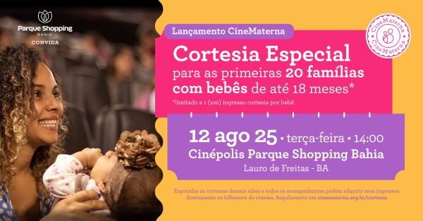 O CineMaterna chega a Lauro de Freitas na Bahia, no Cinépolis do Parque Shopping Bahia, com sua proposta inovadora de sessões de cinema pensadas especialmente para mães com bebês de até 18 meses. A primeira exibição será no dia 12 de Agosto, às 14h, e contará com ingressos cortesia para as 20 primeiras famílias com bebês (limitado a 1 ingresso por bebê).