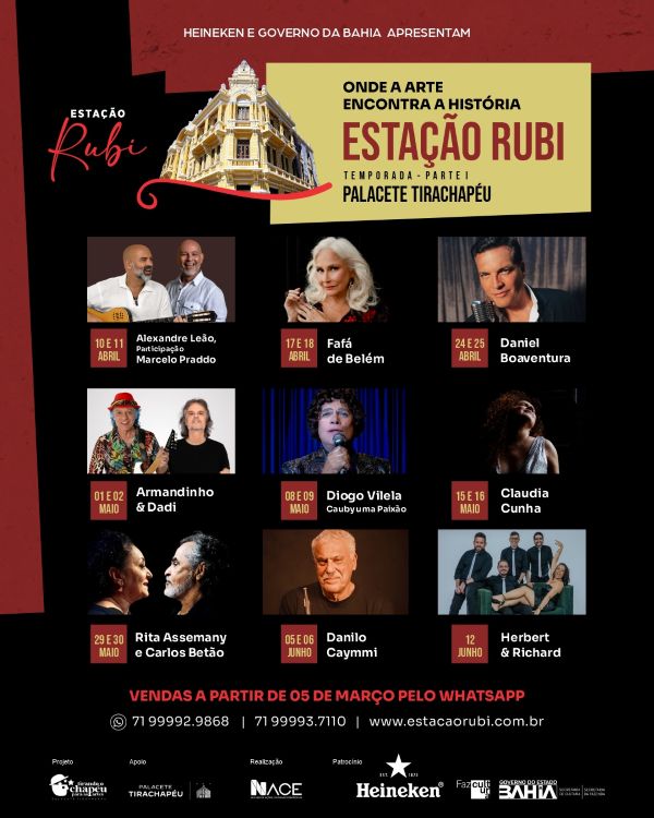 No icônico Palacete Tirachapéu, e depois de uma ausência de dois anos, a Estação Rubi está de volta com seu charmoso café-teatro – agora implantado no ‘Salão dos Fundadores’ do Palacete – e com uma programação musical de alto nível, compreendendo apresentações de abril a agosto deste ano.
