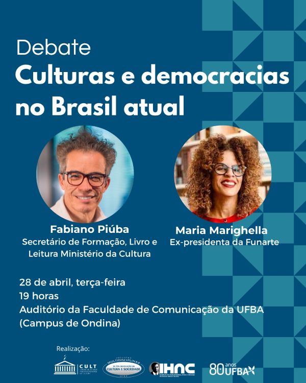 Salvador recebe nesta terça-feira, dia 28 de abril, o debate “Culturas e democracias no Brasil atual”, que reúne nomes do cenário cultural e político brasileiro para refletir sobre o papel das culturas no contexto contemporâneo. O encontro é aberto ao público e acontece às 19h, no auditório da Faculdade de Comunicação da Universidade Federal da Bahia (Facom/UFBA), no campus de Ondina.