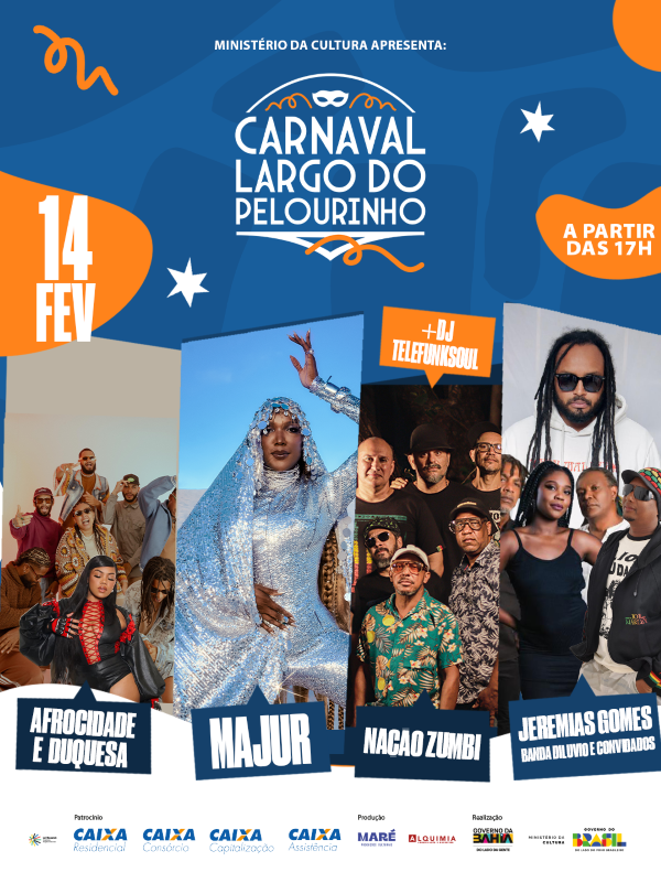 O projeto ‘Carnaval Largo do Pelourinho‘ é uma realização do Governo da Bahia, Ministério da Cultura (MINC) e Governo do Brasil; patrocinado pela CAIXA Residencial, CAIXA Consórcio, CAIXA Capitalização e CAIXA Assistência; produção da Maré Produções Culturais e Alquimia Comunicação e Marketing; através da Lei Federal de Incentivo à Cultura.