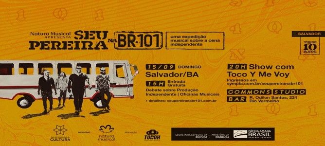 A gente se vê no Commons, né, Salvador? Dentro do projeto #SeuPereiraNaBR101, chegaremos por aí no dia 15/09 para realização da programação de debate e oficinas gratuitos à tarde e, à noite, dividindo o palco com Toco Y Me Voy, um show daqueles para animar ainda mais!