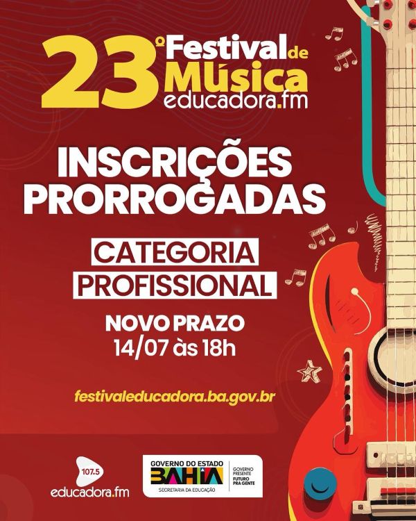 A inscrição para a categoria profissional da maior premiação da música independente da Bahia teve seu prazo estendido. Agora, os músicos e bandas que desejam concorrer no 23° Festival de Música da Rádio Educadora FM têm até o dia 14 de julho para participar. Já a categoria estudantil segue com o mesmo prazo de inscrições, abertas até o dia 1° de agosto. Os interessados deverão se inscrever através do site https://festivaleducadora.ba.gov.br/.