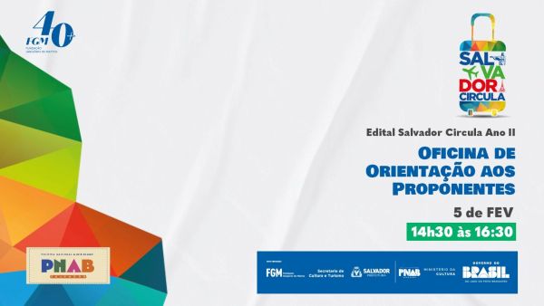 Com o objetivo de democratizar o acesso e esclarecer dúvidas técnicas sobre o Edital Salvador Circula – Ano II, a Fundação Gregório de Mattos (FGM) promove a Oficina de Orientação para Proponentes, que será realizada na próxima quinta-feira (5), das 14h30 às 16h30,  em formato online, com transmissão ao vivo no canal da FGM no Youtube.
