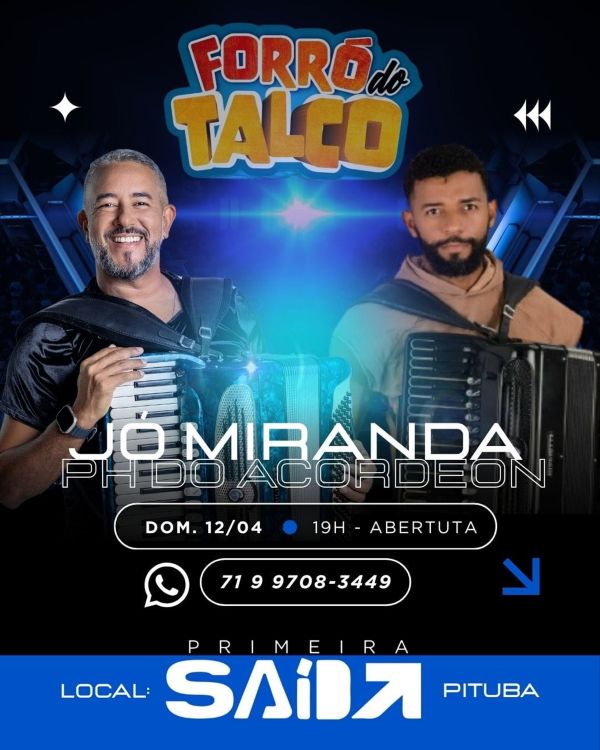 O Forró do Talco acontece neste domingo (12), às 19h, na Primeira Saída, na Pituba. Sob o comando do cantor e sanfoneiro Jó Miranda esta edição contará com a participação de PH do Acordeon.