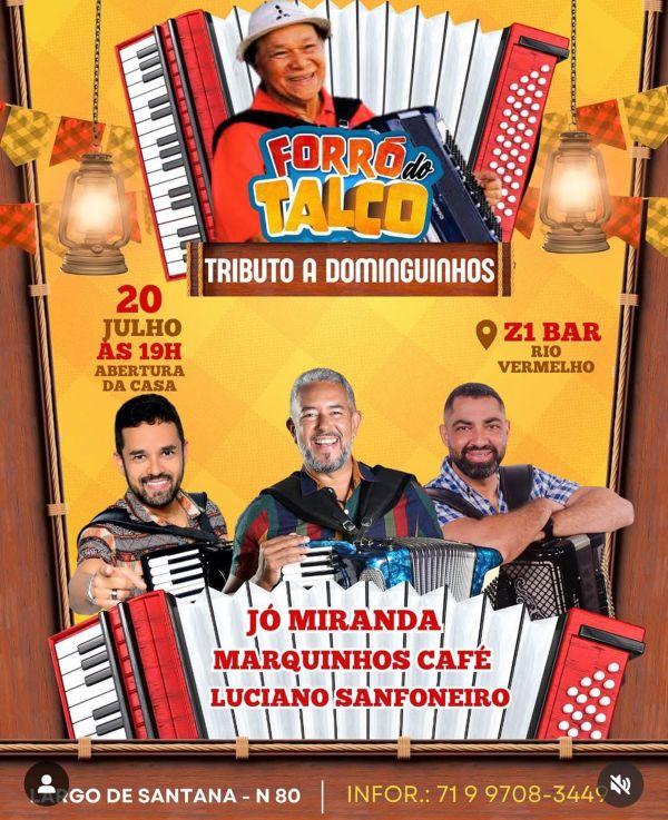 Idealizado pelo cantor, compositor e sanfoneiro Jó Miranda, o Forró do Talco é um dos principais espaços dedicados à valorização do forró tradicional em Salvador. No palco, além de Jó Miranda, também se apresentam Marquinhos Café e Luciano Sanfoneiro, nomes reconhecidos na cena musical nordestina.