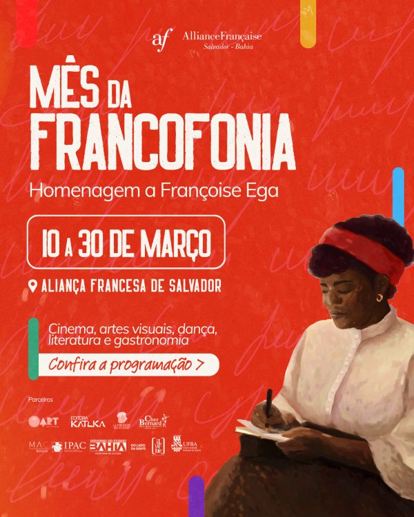 A Aliança Francesa Salvador – Bahia realiza em março de 2026 o Mês da Francofonia com atividades culturais das mais diversas linguagens! Iniciando em 10 de março, o evento tem como homenageada a escritora e ativista francesa Françoise Ega e uma programação majoritariamente gratuita que vai até 30 de março.