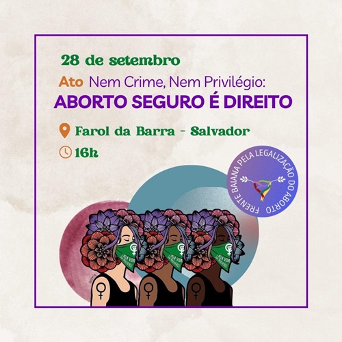 “Nem crime, nem privilégio: Aborto seguro é direito”. Esse é o tema do ato público que a Frente Baiana pela Legalização do Aborto (FBLA) promove dia 28 (sábado), às 16h, no Farol da Barra, em Salvador.