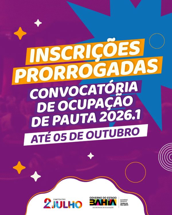 O prazo de inscrição para o Edital de Ocupação de Pauta do Cineteatro 2 de Julho foi prorrogado. Os produtores de artes cênicas, música, audiovisual e multilinguagens têm até o dia 5 de outubro para enviar suas propostas para o primeiro semestre de 2026.
