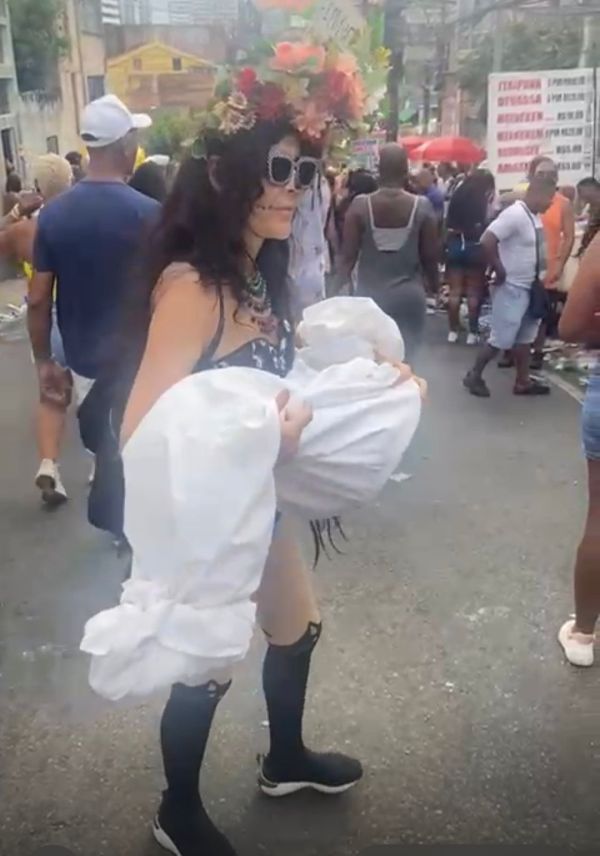 Na ação, a artista percorreu a avenida carregando nos braços o corpo de uma mulher em tamanho real, coberto por um lençol branco, simulando uma vítima de feminicídio. A imagem, dura e silenciosa, rompeu com a atmosfera festiva do carnaval para impor aos foliões e foliãs uma pausa forçada diante da violência cotidiana que atinge mulheres em todo o país. O objetivo da performance foi justamente esse: fazer com que o público fosse atravessado pela cena, sem possibilidade de desvio ou indiferença.