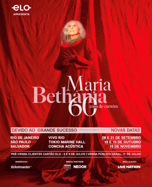 Após esgotar quatro shows no Rio de Janeiro, quatro em São Paulo e um em Salvador, a série de apresentações comemorativas dos 60 anos de carreira de Maria Bethânia acaba de ganhar datas extras. Foram adicionados dois shows no Rio de Janeiro, nos dias 20 e 21 de setembro, no Vivo Rio; dois em São Paulo, nos dias 18 e 19 de outubro, no Tokio Marine Hall; e no dia 16 de novembro, em Salvador, na Concha Acústica.