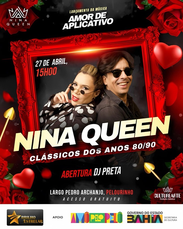 A cantora Nina Queen promete agitar a Praça Pedro Archanjo, no Pelourinho, com um show gratuito neste domingo, 27 de abril, a partir das 15h. Conhecida por sua presença marcante e voz poderosa, a artista apresenta um repertório que mergulha nos grandes sucessos do pop, rock e dance dos anos 80 e 90, convidando o público para uma verdadeira viagem nostálgica.