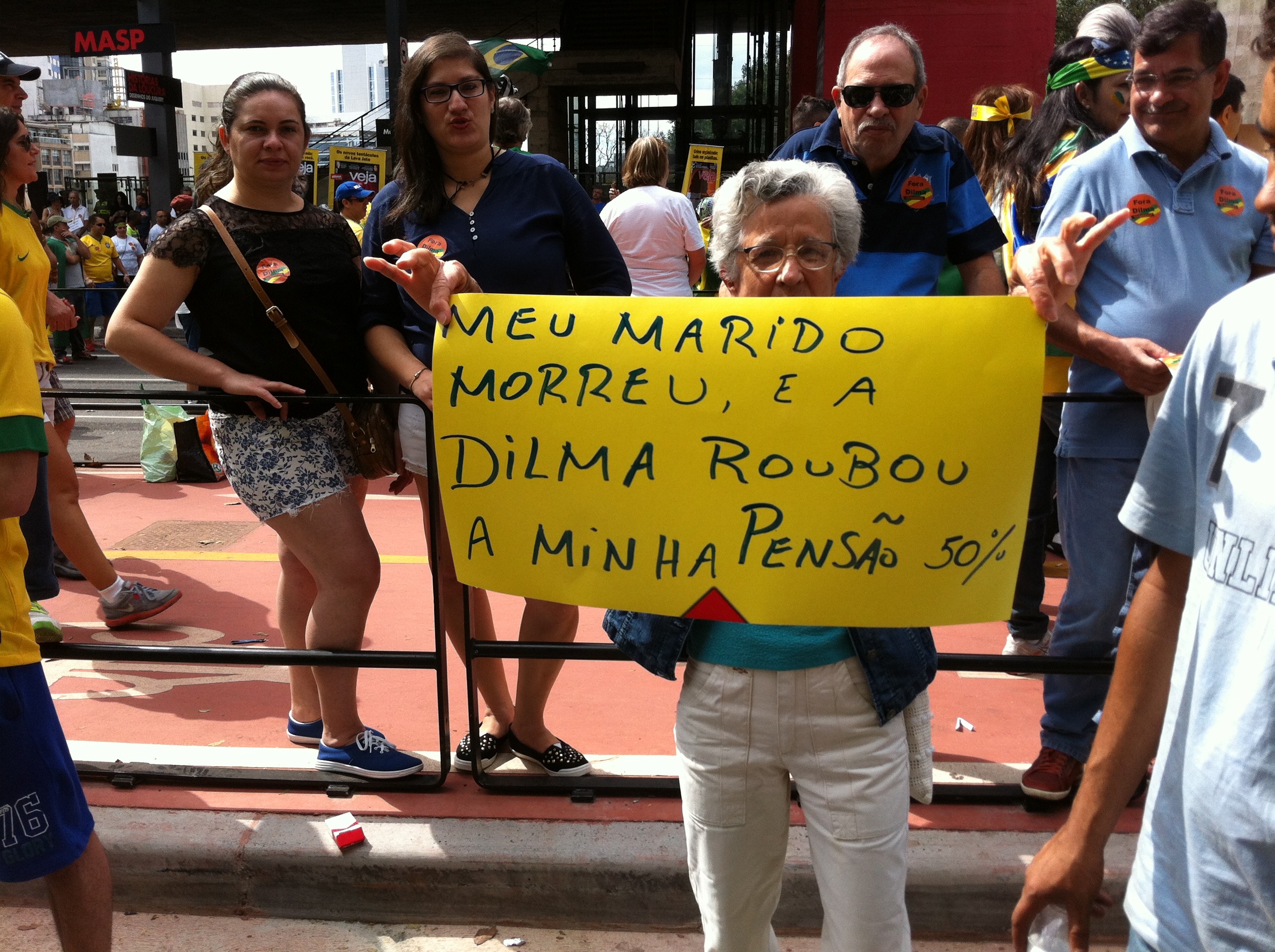 Uma senhora fofa empunhava um cartaz no qual se lia: “Dilma, pena que não te enforcaram no Doi Codi”
