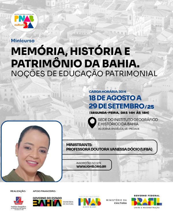 O Instituto Geográfico e Histórico da Bahia promove o minicurso “Memória, História e Patrimônio da Bahia: noções básicas de Educação Patrimonial”. As aulas serão realizadas nas tardes de segunda-feira, das 14h às 18h, de 18 de agosto a 29 de setembro de 2025, e serão ministradas pela professora doutora Vanessa de Almeida Dócio.