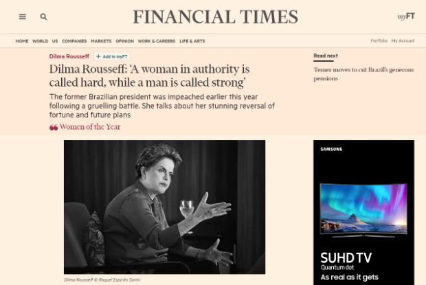 E viralizou nas redes sociais o prêmio dado a Dilma pelo Financial Times como uma das mulheres do ano. Dilma foi escolhida porque protagonizou um dos maiores dramas vividos no ano por uma mulher em todo o mundo. Falo do golpe, naturalmente.