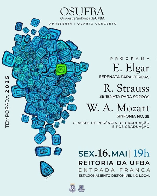 A Orquestra Sinfônica da Universidade Federal da Bahia (OSUFBA), mais antiga orquestra em atividade contínua no estado da Bahia, realiza gratuitamente o quarto concerto da sua Temporada 2025. Com obras de Elgar, Strauss e Mozart, a apresentação acontece na sexta-feira (16), às 19h, no Salão Nobre da Reitoria da UFBA.