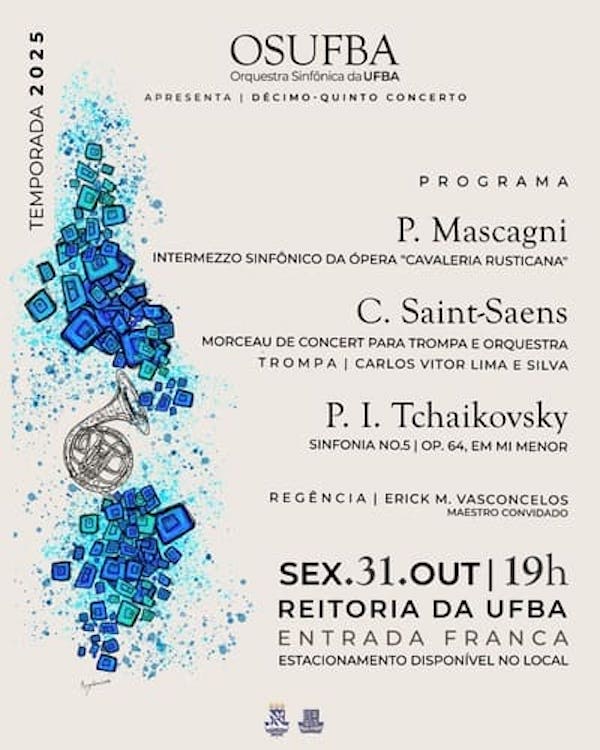 A Orquestra Sinfônica da Universidade Federal da Bahia (OSUFBA), mais antiga orquestra em atividade contínua no estado da Bahia, realiza gratuitamente o décimo-quinto concerto da sua Temporada 2025. Com obras de Pietro Mascagni, Camille Saint-Saëns e Piotr Ilitch Tchaikovsky, a apresentação acontece na sexta-feira (31), às 19h, na Reitoria da UFBA, em Salvador.