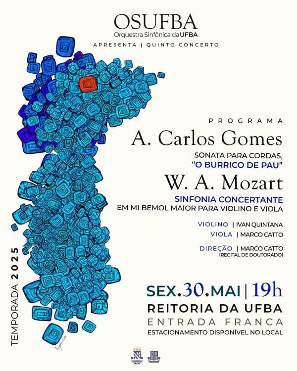 Com participação dos solistas Ivan Quintana (violino) e Marco Catto (viola), a OSUFBA se apresenta sob direção de Marco Catto, em seu recital de doutorado. Neste concerto especial, a orquestra apresenta a Sonata para Cordas “o Burrico de Pau”, de Antônio Carlos Gomes e a Sinfonia Concertante em Mi Bemol Maior para Violino e Viola, de Mozart.