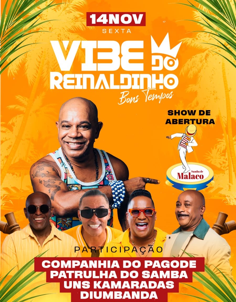 Os grupos Patrulha do Samba, Uns Camarada, Companhia do Pagode e De Umbanda estão confirmados na segunda edição da Vibe do Reinaldinho – Bons Tempos, que acontece no dia 14 de novembro (sexta-feira), a partir das 14h, no Sunset Music Bar, Pituaçu. O evento, comandado pelo cantor Reinaldinho, ex-integrante do Terra Samba, celebra os clássicos do pagode baiano e promete reunir o público em uma tarde de dança, alegria e nostalgia.