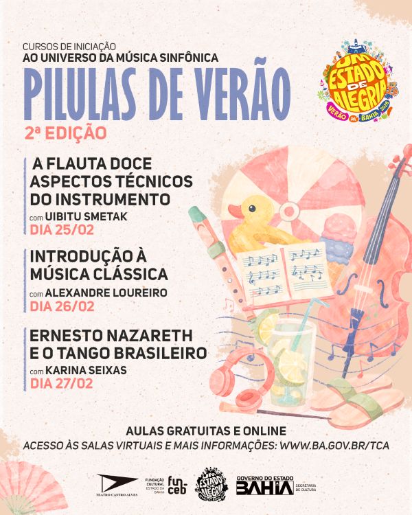 Para fechar o mês de fevereiro com sinfonia, o Curso de Música do TCA lança a segunda edição das “Pílulas de Verão”, minicursos gratuitos e virtuais de introdução ao universo da música sinfônica. As atividades acontecem entre os dias 25 e 27 de fevereiro (quarta a sexta-feira), das 10h às 11h30, e para acessar basta ingressar na sala virtual nos horários indicados. As turmas são limitadas a 98 participantes por curso e os links de acesso estão disponíveis no site ba.gov.br/tca.