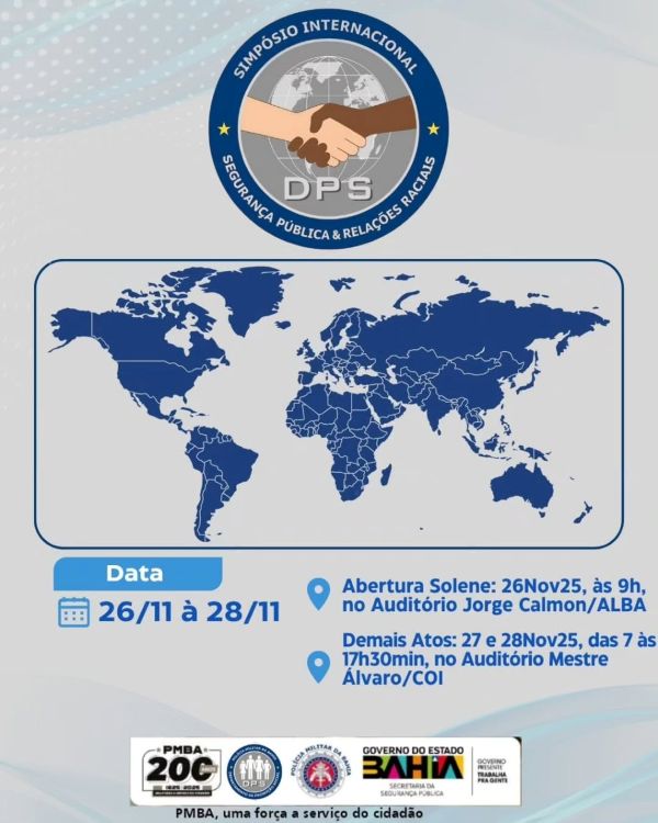 A Polícia Militar da Bahia (PMBA) realizará, entre os dias 26 e 28 de novembro de 2025, o Simpósio Internacional de Segurança Pública e Relações Raciais, encontro que reunirá especialistas, pesquisadores, autoridades civis e militares, além de representantes de instituições públicas e da sociedade civil. O objetivo é ampliar o debate sobre diversidade, direitos humanos e práticas de segurança orientadas pela equidade racial.