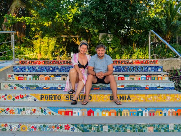 4. Escadarinha Taperapuan: É o novo point instagramável de Porto Seguro! Como o nome sugere, trata-se de uma pequena escadaria com degraus recriados a partir de um mosaico com recortes de ladrilhos e azulejos. Agora multicoloridos, eles representam os elementos que resumem a cultura e a história da região: as casas coloniais da cidade histórica, os tradicionais barcos pesqueiros, a fauna marinha, a exuberante mata atlântica, símbolos indígenas Pataxós e elementos afro-brasileiros. Está localizada em frente ao eco-clube de praia do Resort Arcobaleno, na Praia de Taperapuan.