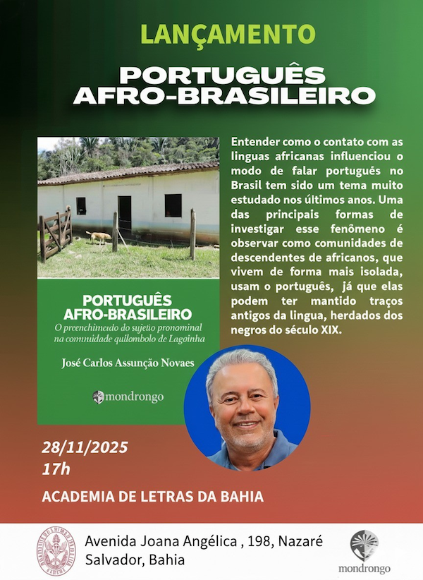 O Professor Doutor José Carlos Assunção Novaes lança, dentro das comemorações do novembro negro, o livro “Português Afro-brasileiro: O preenchimento do pronome sujeito na comunidade quilombola de Lagoinha”. O evento acontece no dia 28 deste mês, às 17h, na Academia de Letras da Bahia, faz parte da programação do Curso Castro Alves promovido pela instituição. Durante o lançamento, o professor fará uma palestra sobre o tema e, logo a seguir, participará de uma sessão de autógrafos, momento em que receberá os convidados e amigos.