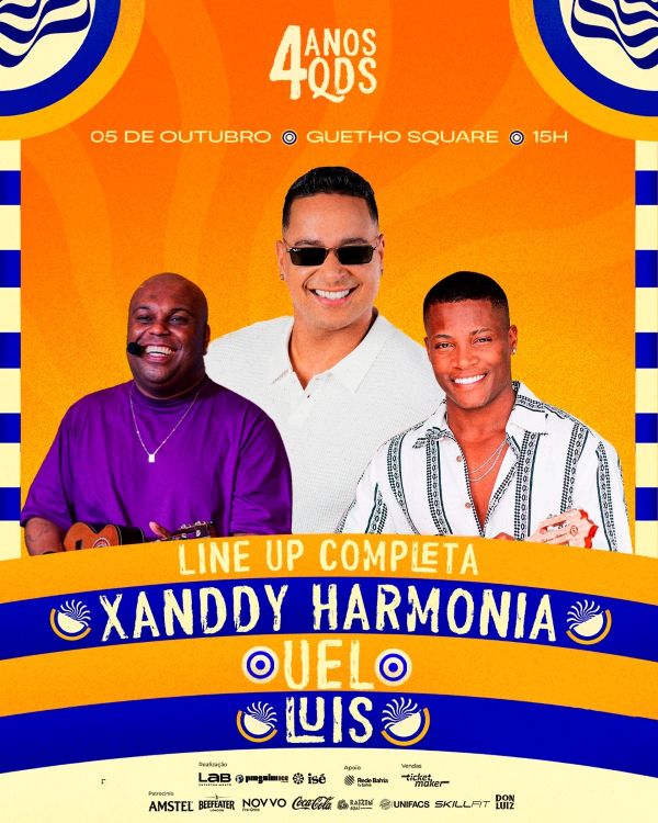 Com um palco 360°, a festa reunirá os amantes do gênero em uma atmosfera repleta de swing e pagode. Entre as atrações, destaque para Xanddy Harmonia, Uel e Simplesmente Luís, que comandarão o palco do ‘Quintal’ com muita música e celebração.