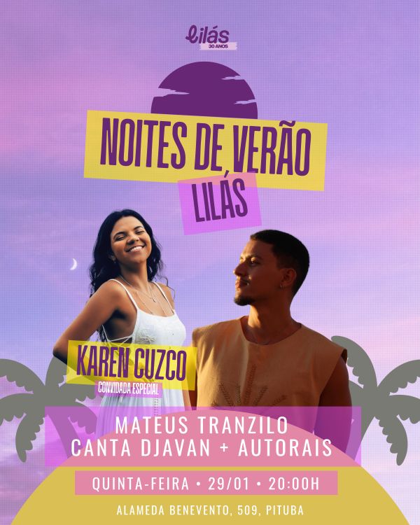 Clássicos de Djavan dão o tom do show “Noite de Verão Lilás”, que acontece nesta quinta-feira (29), às 20h, no Lilás Cozinha (Spaghetti Lilás, Alameda Benevento, 509, Pituba), sob o comando do cantor e compositor Mateus Tranzilo. Após estreia com a varanda do Lilás cheia para prestigiar o evento, a segunda noite terá a participação especial da cantora Karen Cuzco, vencedora na última edição do Prêmio Educadora.
