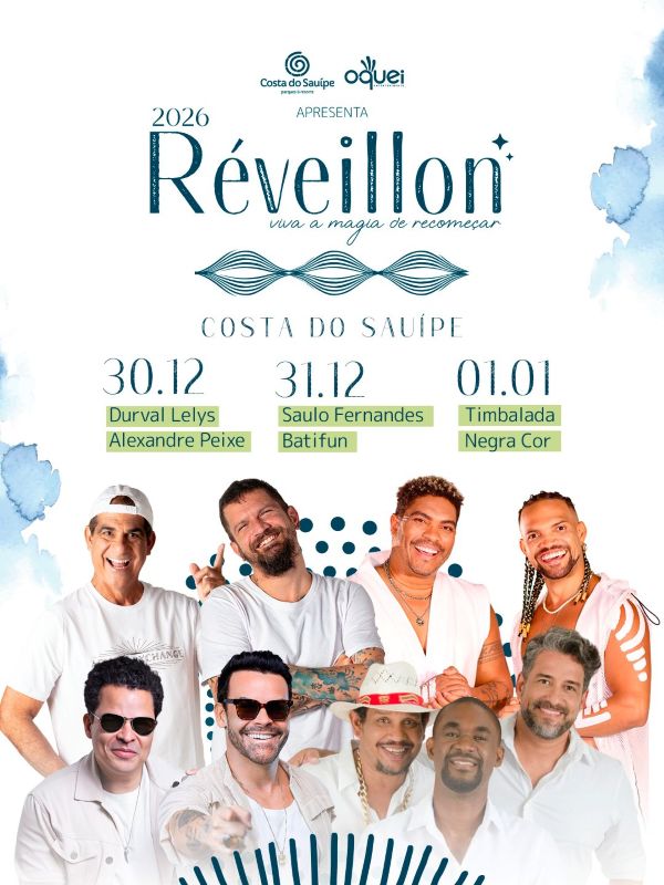 O Réveillon Costa do Sauípe será palco de uma celebração especial para marcar a chegada de 2026 com tudo o que a Bahia tem de mais vibrante: música, alegria, gastronomia de alta qualidade e um cenário paradisíaco à beira-mar. Em um dos destinos mais desejados do país, o público viverá três dias de festa com estrutura all inclusive, shows de grandes nomes da música baiana, ceia especial e experiências que prometem ficar para sempre na memória. Os ingressos avulsos para as noites de festa já estão à venda na TicketMaker, enquanto os pacotes de hospedagem podem ser adquiridos pelo site oficial da Costa do Sauípe (www.costadosauipe.com.br).