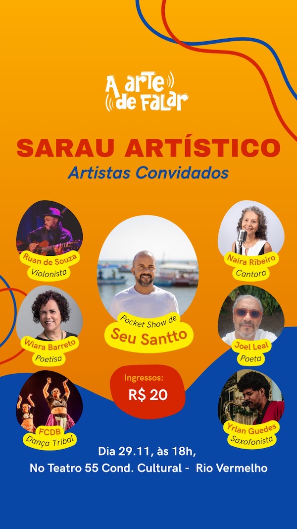 Um encontro que mistura arte, cultura, expressão vocal e o exercício da fala pública, essa é a proposta do Sarau Artístico do projeto A Arte de Falar. Idealizado e coordenado por Mariana Freire, que há 14 anos é Educadora da Fala Pública Profissional, o evento reúne alunos do curso trimestral apresentando sua Dramaturgia de Fala, além de artistas convidados de múltiplas linguagens: música, poesia e dança. O sarau acontece dia 29 de novembro, das 18h às 20h, no Teatro 55 Condomínio Cultural, no Rio Vermelho. Os ingressos custam R$ 20 e podem ser adquiridos pelo Instagram @aartedefalar.