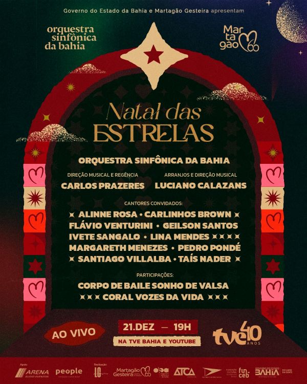 A TVE transmite neste domingo (21) o concerto beneficente ‘Natal das Estrelas’, realizado pela Orquestra Sinfônica da Bahia (OSBA). Com regência e direção musical dos maestros Carlos Prazeres e Luciano Calazans, o evento acontece às 19h, na Concha Acústica do Teatro Castro Alves (TCA).
