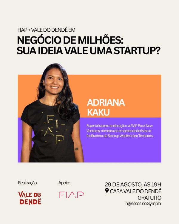O evento gratuito acontece na Casa Vale do Dendê e conta com a presença de Adriana Kaku, especialista em aceleração na FIAP Rock New Ventures, mentora de empreendedorismo e facilitadora de Startup Weekend da Techstars.