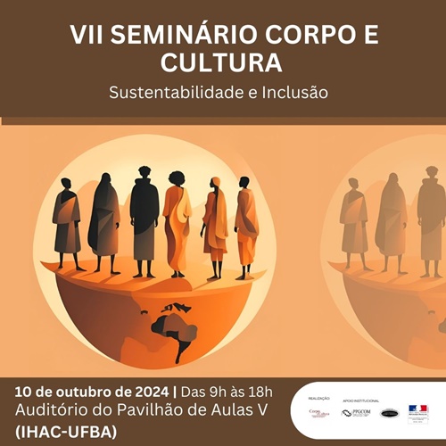 O VII Seminário Corpo e Cultura é uma promoção do grupo de pesquisa Corpo e Cultura (Cadastrado no CNPq) – sob a coordenação das professoras doutoras Renata Pitombo Cidreira (UFRB) e Beatriz Ferreira Pires (USP) – com o apoio institucional e financeiro do Programa Multidisciplinar de Pós-graduação em Cultura e Sociedade (Pós-Cultura) da Universidade Federal da Bahia (UFBA), e do Programa de Pós-graduação em Comunicação – Mídia e Formatos Narrativos (PPGCOM) da UFRB. As inscrições para o evento são gratuitas e podem ser feitas através do link disponível no Instagram: @gpcorpoecultura.