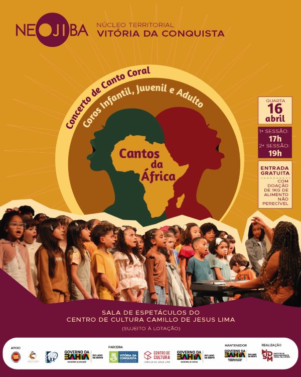 No próximo dia 16 de abril, o Núcleo Territorial NEOJIBA (NTN) de Vitória da Conquista realiza sua primeira apresentação de 2026. O Concerto Cantos da África vai reunir os Coros Infantil, Juvenil e Adulto do programa para uma viagem musical pelo continente africano no palco do Centro de Cultura Camillo de Jesus Lima. O evento contará com duas sessões, às 17h e às 19h.