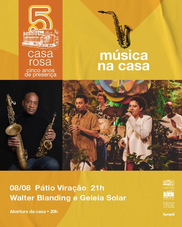 Na programação especial do aniversário de 5 anos da Casa Rosa, o jazz dos Estados Unidos e da Bahia se reúnem: o saxofonista norte-americano Walter Blanding e a banda baiana Geleia Solar sobem ao palco do espaço no dia 8 de agosto, às 21h. Ingressos custam R$ 40 (inteira) e R$ 20 (meia) e estão à venda pela Sympla.